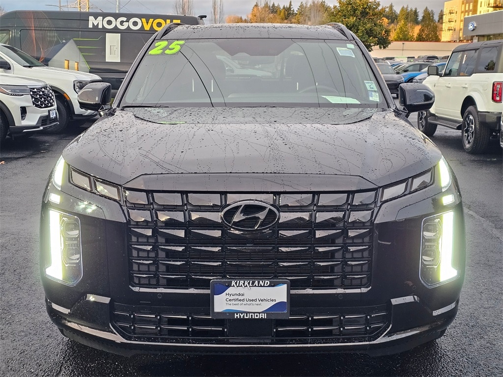 CARFAX One-Owner. ONE OWNER, Hyundai Certified Used Vehicles Certified, 12 Speakers, 3rd row seats: split-bench, 4-Wheel Disc Brakes, ABS brakes, Air Conditioning, Alloy wheels, AM/FM radio: SiriusXM, Apple CarPlay & Android Auto, Auto High-beam Headlights, Auto-dimming door mirrors, Auto-dimming Rear-View mirror, Auto-leveling suspension, Automatic temperature control, Brake assist, Bumpers: body-color, Cargo Blocks, Cargo Net, Carpeted Floor Mats, Compass, Delay-off headlights, Driver door bin, Driver vanity mirror, Dual front impact airbags, Dual front side impact airbags, Electronic Stability Control, Emergency communication system, Exterior Parking Camera Rear, First Aid Kit, Four wheel independent suspension, Front anti-roll bar, Front Bucket Seats, Front Center Armrest, Front dual zone A/C, Front reading lights, Fully automatic headlights, Garage door transmitter: HomeLink, harman/kardon® Speakers, Heads-Up Display, Heated & Ventilated Front Bucket Seats, Heated door mirrors, Heated front seats, Heated rear seats, Heated steering wheel, Illuminated entry, Knee airbag, Leather steering wheel, Low tire pressure warning, Memory seat, Microfiber Suede Seat Trim, Navigation System, Occupant sensing airbag, Option Group 01, Outside temperature display, Overhead airbag, Overhead console, Panic alarm, Passenger door bin, Passenger vanity mirror, Power door mirrors, Power driver seat, Power Liftgate, Power moonroof, Power passenger seat, Power steering, Power windows, Radio data system, Radio: AM/FM/MP3 Premium Audio System, Rain sensing wipers, Rear air conditioning, Rear anti-roll bar, Rear audio controls, Rear reading lights, Rear side impact airbag, Rear window defroster, Rear window wiper, Reclining 3rd row seat, Remote keyless entry, Roof rack, Security system, Speed control, Speed-sensing steering, Split folding rear seat, Spoiler, Steering wheel mounted audio controls, Tachometer, Telescoping steering wheel, Tilt steering wheel, Tow Hitch, Traction control, Trip computer, Turn signal indicator mirrors, Variably intermittent wipers, Ventilated front seats, Ventilated rear seats, Wheel Locks, Wheels: 20" x 7.5J Black Liquid Paint Alloy. 2025 Hyundai Palisade Calligraphy Night Edition V6 8-Speed Automatic with SHIFTRONIC AWD 4D Sport Utility Abyss Black Pearl Certified. Hyundai Certified Used Vehicles Details: