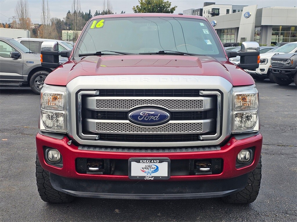 Recent Arrival! CARFAX One-Owner. 4WD, ABS brakes, Alloy wheels, Compass, Electronic Stability Control, Front dual zone A/C, Heated door mirrors, Illuminated entry, Low tire pressure warning, Remote keyless entry, Traction control. 2016 Ford F-350SD Platinum 6.2L V8 EFI SOHC 16V Flex Fuel TorqShift 6-Speed Automatic 4WD 4D Crew Cab Ruby Red Metallic Tinted Clearcoat