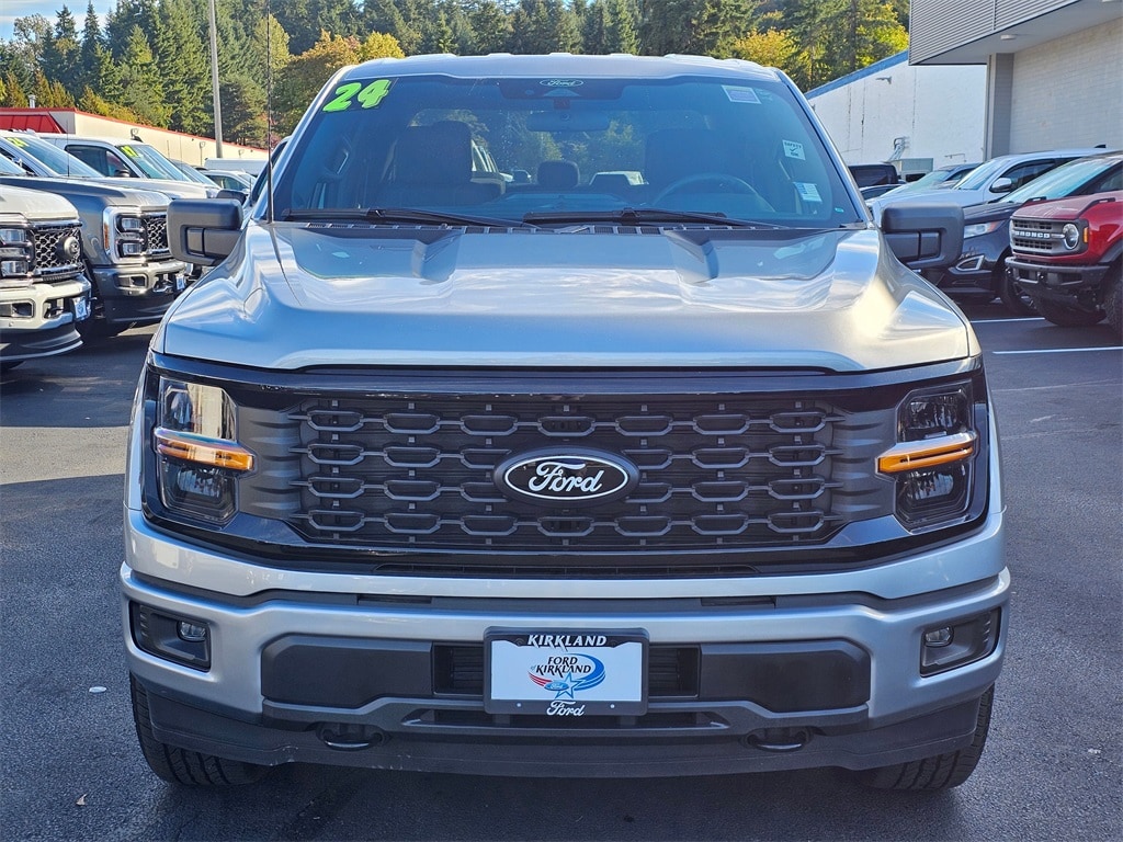 Clean CARFAX. CARFAX One-Owner. Odometer is 5646 miles below market average! 4WD, 3.55 Axle Ratio, 4-Wheel Disc Brakes, 400W Cab & Bed Outlets, 6 Speakers, 6" Black Running Boards, ABS brakes, Air Conditioning, Alloy wheels, AM/FM radio: SiriusXM with 360L, Auto High-beam Headlights, Black Exterior Badging, Brake assist, Bumpers: body-color, Compass, Console Worksurface, Delay-off headlights, Driver door bin, Dual front impact airbags, Dual front side impact airbags, Electronic Locking w/3.55 Axle Ratio, Electronic Stability Control, Emergency communication system: SYNC 4 911 Assist, Equipment Group 200A Standard, First Aid Kit w/Ford Logo, Front anti-roll bar, Front Bucket Seats, Front Center Armrest, Front fog lights, Front reading lights, Front wheel independent suspension, Fully automatic headlights, Gray Box Side Decal, GVWR: 6,650 lbs Payload Package, Heated door mirrors, Illuminated entry, Low tire pressure warning, Mobile Office Package, Navigation system: Connected Navigation, Occupant sensing airbag, Outside temperature display, Overhead airbag, Overhead console, Panic alarm, Passenger door bin, Passenger vanity mirror, Power door mirrors, Power steering, Power windows, Radio data system, Radio: AM/FM SiriusXM w/360L, Rear step bumper, Rear window defroster, Remote keyless entry, Security system, Speed control, Split folding rear seat, Steering wheel mounted audio controls, STX Black Appearance Package, SYNC 4 w/Enhanced Voice Recognition, Tachometer, Telescoping steering wheel, Tilt steering wheel, Traction control, Tray Style Floor Liner w/Carpet Mats, Trip computer, Unique Sport Cloth 40/Console/40 Front-Seats, Variably intermittent wipers, Voltmeter, Wheels: 20" Dark Gray w/Machined Aluminum, Wheels: 20" Gloss Black, 4WD. 2024 Ford F-150 STX 2.7L V6 EcoBoost 10-Speed Automatic 4WD 4D SuperCrew Iconic Silver Metallic