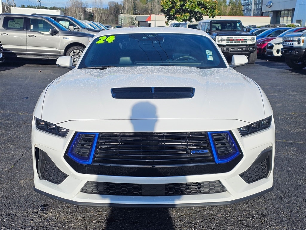 Clean CARFAX. CARFAX One-Owner. ONE OWNER, Active Anti-Theft System, B&O Sound System by Bang & Olufsen, Black Burkeshire w/Accent Stitching Floor Mats, Black Horizontal Bars w/Rave Blue Bezels Grille, Black Onyx w/Accent Stitching Door Trim Panels, Black Side Stripe, California Special Package, Connected Built-In Navigation, Equipment Group 401A High Package, Ford Co-Pilot360 Assist+, Headlamps w/Black Bezels, Illuminated Door-Sill Scuff Plates, Integrated Turn Signals, Leather Bucket Seats, Leather-Trimmed Bucket Seats w/Color Accents, Locking Center Console, Memory Driver Seat & Mirrors, Pre-Collision Assist w/Automatic Emergency Braking, Rave Blue Side Stripe, Security Package, Wheel Locking Kit, 4-Wheel Disc Brakes, 9 Speakers, ABS brakes, Active Valve Performance Exhaust, Air Conditioning, Alloy wheels, AM/FM radio: SiriusXM with 360L, AM/FM Stereo, Auto High-beam Headlights, Auto-dimming Rear-View mirror, Automatic temperature control, Brake assist, Bumpers: body-color, Climate Controlled Heated/Cooled Front Seats, Compass, Delay-off headlights, Driver door bin, Driver vanity mirror, Dual front impact airbags, Dual front side impact airbags, Electronic Stability Control, Emergency communication system: 911 Assist, Exterior Parking Camera Rear, Four wheel independent suspension, Front anti-roll bar, Front Bucket Seats, Front Center Armrest, Front dual zone A/C, Front reading lights, Fully automatic headlights, Garage door transmitter, HD Radio, Heated door mirrors, Heated front seats, Heated steering wheel, Illuminated entry, Knee airbag, Leather Shift Knob, Leather steering wheel, Leather-Trimmed Bucket Seats, Low tire pressure warning, Occupant sensing airbag, Outside temperature display, Overhead airbag, Overhead console, Panic alarm, Passenger door bin, Passenger vanity mirror, Power door mirrors, Power driver seat, Power passenger seat, Power steering, Power windows, Premium Floor Mats w/Metal Gray Accent Stitch, Radio data system, Rain sensing wipers, Rear anti-roll bar, Rear Parking Sensors, Rear window defroster, Remote keyless entry, Seat Belt w/Color Accent, SiriusXM w/360L, Speed control, Speed-sensing steering, Speed-Sensitive Wipers, Split folding rear seat, Spoiler, Sport steering wheel, Steering wheel mounted audio controls, SYNC 4.0 QNX, Tachometer, Telescoping steering wheel, Tilt steering wheel, Traction control, Trip computer, Turn signal indicator mirrors, Variably intermittent wipers, Ventilated front seats, Voltmeter, Wheels: 19" x 8.5" Shadow Silver-Painted Aluminum, Active Anti-Theft System, B&O Sound System by Bang & Olufsen, Black Burkeshire w/Accent Stitching Floor Mats, Black Horizontal Bars w/Rave Blue Bezels Grille, Black Onyx w/Accent Stitching Door Trim Panels, Black Side Stripe, California Special Package, Connected Built-In Navigation, Equipment Group 401A High Package, Ford Co-Pilot360 Assist+, Headlamps w/Black Bezels, Illuminated Door-Sill Scuff Plates, Integrated Turn Signals, Leather Bucket Seats, Leather-Trimmed Bucket Seats w/Color Accents, Locking Center Console, Memory Driver Seat & Mirrors, Pre-Collision Assist w/Automatic Emergency Braking, Rave Blue Side Stripe, Security Package, Wheel Locking Kit. 2024 Ford Mustang GT Premium 5.0L V8 Ti-VCT 10-Speed Automatic RWD 2D Coupe Oxford White