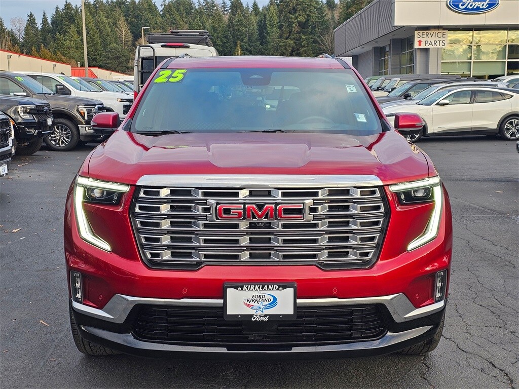 Clean CARFAX. CARFAX One-Owner. Odometer is 2322 miles below market average! AWD, After Dark Leather, 12 Speakers, 1st and 2nd Row All-Weather Floor Liner, 3 Years SiriusXM, 3.49 Final Drive Axle Ratio, 3rd Row 60/40 Power Split-Folding Bench, 3rd Row All-Weather Floor Liner, 3rd row seats: split-bench, 4-Wheel Disc Brakes, 6-Way Power Front Passenger Seat Adjuster, 7-Passenger Seating (2-2-3 Seating Configuration), 8-Way Power Driver Seat Adjuster, ABS brakes, Air Conditioning, Alloy wheels, AM/FM radio: SiriusXM with 360L, Apple CarPlay/Android Auto, Auto High-beam Headlights, Auto-dimming door mirrors, Auto-dimming Rear-View mirror, Automatic temperature control, Bodyside moldings, Bose Performance 16-Speaker System with Sub-Woofer, Bose Premium 12-Speaker System with Sub-Woofer, Brake assist, Bumpers: body-color, Cargo Net, Compass, Delay-off headlights, Denali Reserve Package, Driver 4-Way Power Lumbar Seat Adjuster, Driver Attention Assist, Driver door bin, Driver vanity mirror, Dual front impact airbags, Dual front side impact airbags, Electronic Stability Control, Emergency communication system: OnStar Services capable, Enhanced Automatic Parking Assist, Exterior Parking Camera Rear, Floor Liner Package, Four wheel independent suspension, Front and Rear Painted Splash Guards, Front anti-roll bar, Front Bucket Seats, Front Center Armrest, Front dual zone A/C, Front fog lights, Front License Plate Bracket, Front Passenger 4-Way Power Lumbar Seat Adjuster, Front reading lights, Fully automatic headlights, Garage door transmitter, Genuine wood console insert, Genuine wood dashboard insert, Genuine wood door panel insert, Heads-Up Display, Heated and Ventilated Driver and Front Passenger Seats, Heated door mirrors, Heated Driver and Front Passenger Seats, Heated front seats, Heated rear seats, Heated steering wheel, Illuminated entry, Integrated Cargo Liner, Leather steering wheel, Low tire pressure warning, Memory Package, Memory seat, Mobile Service Plus, Navigation System, Occupant sensing airbag, Outside temperature display, Overhead airbag, Overhead console, Panic alarm, Panoramic Power Sunroof with Sunshade, Passenger door bin, Passenger vanity mirror, Perforated Leather-Appointed Seat Trim, Performance Suspension, Power door mirrors, Power driver seat, Power Liftgate, Power passenger seat, Power steering, Power windows, Preferred Equipment Group 5SB, Radio data system, Radio: 15" Diagonal Premium GMC Infotainment System, Rain sensing wipers, Rear air conditioning, Rear anti-roll bar, Rear Camera Mirror, Rear reading lights, Rear side impact airbag, Rear window defroster, Rear window wiper, Remote keyless entry, Security system, SiriusXM with 360L, Speed control, Speed-sensing steering, Split folding rear seat, Spoiler, Sport steering wheel, Steering wheel memory, Steering wheel mounted audio controls, Super Cruise, Super Cruise Package, Tachometer, Telescoping steering wheel, Tilt steering wheel, Traction control, Trip computer, Turn signal indicator mirrors, Variably intermittent wipers, Ventilated front seats, Voltmeter, Wheels: 20" x 8" Pearl Nickel Machined Aluminum, Wheels: 22" x 8.5" Pearl Nickel Machined Aluminum, AWD, After Dark Leather. 2025 GMC Acadia Denali 2.5L DOHC 8-Speed Automatic AWD 4D Sport Utility Volcanic Red Tintcoat