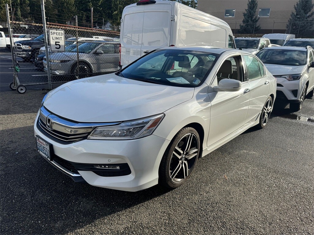 Ivory w/Leather-Trimmed Seats, 19" Alloy Wheels, 4-Wheel Disc Brakes, 7 Speakers, ABS brakes, Air Conditioning, Alloy wheels, AM/FM radio: SiriusXM, Apple CarPlay/Android Auto, Auto High-beam Headlights, Auto-dimming Rear-View mirror, Automatic temperature control, Brake assist, Bumpers: body-color, CD player, Compass, Delay-off headlights, Driver door bin, Driver vanity mirror, Dual front impact airbags, Dual front side impact airbags, Electronic Stability Control, Emergency communication system, Exterior Parking Camera Rear, Four wheel independent suspension, Front anti-roll bar, Front Bucket Seats, Front Center Armrest, Front dual zone A/C, Front fog lights, Front reading lights, Fully automatic headlights, Garage door transmitter: HomeLink, Heated door mirrors, Heated Front Bucket Seats, Heated front seats, Heated rear seats, Illuminated entry, Lane Departure Warning System, Leather-Trimmed Seats, Low tire pressure warning, Memory seat, Navigation System, Occupant sensing airbag, Outside temperature display, Overhead airbag, Overhead console, Panic alarm, Passenger door bin, Passenger vanity mirror, Power door mirrors, Power driver seat, Power moonroof, Power passenger seat, Power steering, Power windows, Radio data system, Radio: 360-Watt AM/FM/CD Premium Audio System, Rain sensing wipers, Rear anti-roll bar, Rear seat center armrest, Rear window defroster, Remote keyless entry, Security system, Speed control, Speed-sensing steering, Speed-Sensitive Wipers, Split folding rear seat, Spoiler, Steering wheel mounted audio controls, Tachometer, Telescoping steering wheel, Tilt steering wheel, Traction control, Trip computer, Turn signal indicator mirrors, Variably intermittent wipers, Ivory w/Leather-Trimmed Seats. 2016 Honda Accord Touring 3.5L V6 SOHC i-VTEC 24V 6-Speed Automatic FWD 4D Sedan White Orchid Pearl