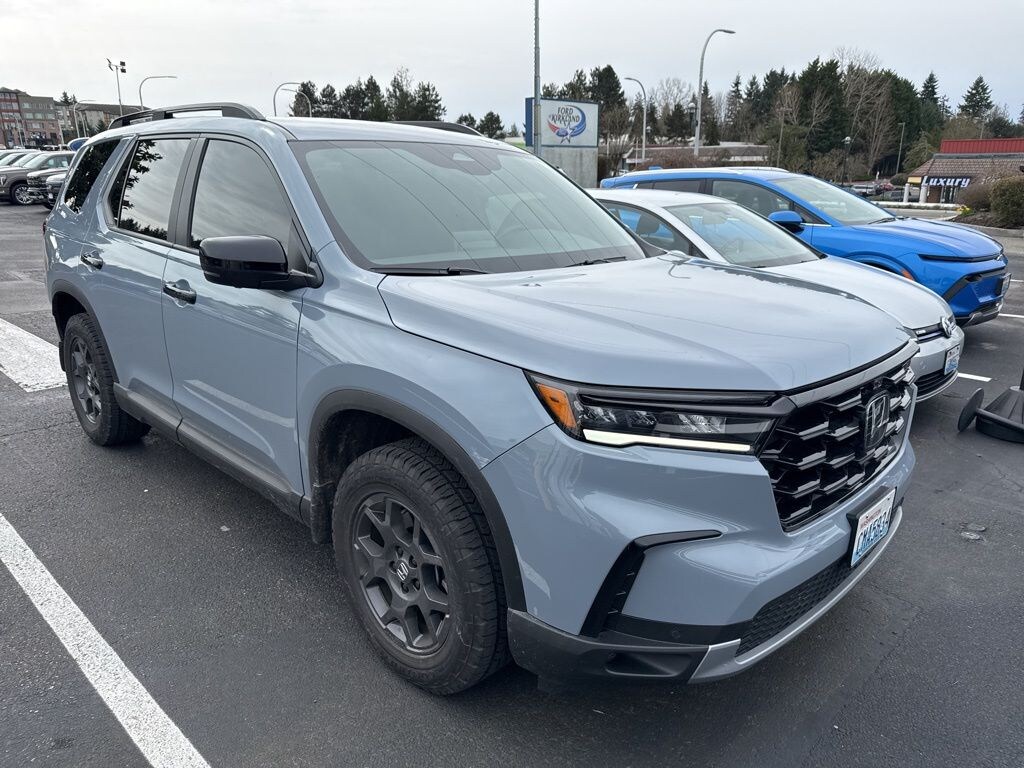 Recent Arrival! CARFAX One-Owner. Odometer is 22532 miles below market average! AWD, 3rd row seats: split-bench, 4-Wheel Disc Brakes, 9 Speakers, ABS brakes, Adaptive Cruise Control: Adaptive Cruise Control (ACC) with Low-Speed Follow, Air Conditioning, Alloy wheels, AM/FM radio: SiriusXM, Apple CarPlay/Android Auto, Auto High-beam Headlights, Auto-dimming Rear-View mirror, Automatic temperature control, Axle Ratio: 4.167, Blind Spot Information (BSI) System warning, Brake assist, Bumpers: body-color, Delay-off headlights, Driver door bin, Driver vanity mirror, Dual front impact airbags, Dual front side impact airbags, Durable Synthetic Leather Seat Trim, Electronic Stability Control, Emergency communication system: HondaLink Assist, Four wheel independent suspension, Front anti-roll bar, Front Bucket Seats, Front Center Armrest, Front dual zone A/C, Front fog lights, Front reading lights, Fully automatic headlights, Garage door transmitter: HomeLink, Heated door mirrors, Heated Front Bucket Seats, Heated front seats, Illuminated entry, Knee airbag, Lane departure: Lane Keeping Assist System (LKAS) active, Low tire pressure warning, Memory seat, Occupant sensing airbag, Outside temperature display, Overhead airbag, Overhead console, Panic alarm, Passenger door bin, Passenger vanity mirror, Power door mirrors, Power driver seat, Power Liftgate, Power moonroof, Power passenger seat, Power steering, Power windows, Radio data system, Radio: 245-Watt Audio System, Rear air conditioning, Rear anti-roll bar, Rear reading lights, Rear window defroster, Rear window wiper, Reclining 3rd row seat, Remote keyless entry, Security system, Speed control, Speed-sensing steering, Speed-Sensitive Wipers, Split folding rear seat, Spoiler, Steering wheel mounted audio controls, Tachometer, Telescoping steering wheel, Tilt steering wheel, Traction control, Trip computer, Turn signal indicator mirrors, Variably intermittent wipers, Wheels: 18" Fully Painted Shark Gray w/Blk Lug Nuts, AWD. 2023 Honda Pilot TrailSport 3.5L V6 DOHC 24V 10-Speed Automatic AWD 4D Sport Utility Sonic Gray Pearl