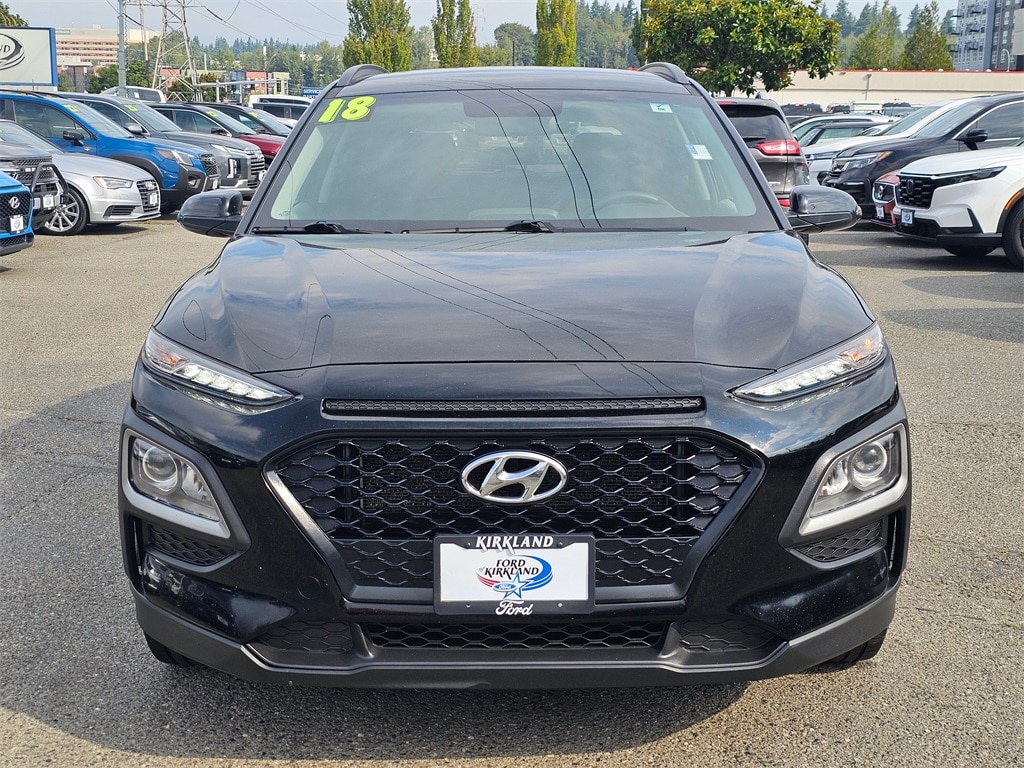 Clean CARFAX. CARFAX One-Owner. 17" x 7.0" Alloy Wheels, 3.648 Axle Ratio, 4-Wheel Disc Brakes, 6 Speakers, 6-Way Adjustable Driver's Seat, ABS brakes, Air Conditioning, Alloy wheels, AM/FM radio: SiriusXM, Apple CarPlay & Android Auto, Brake assist, Bumpers: body-color, Cloth Seat Trim, Delay-off headlights, Driver door bin, Driver vanity mirror, Dual front impact airbags, Dual front side impact airbags, Electronic Stability Control, Exterior Parking Camera Rear, Four wheel independent suspension, Front anti-roll bar, Front Bucket Seats, Front Center Armrest, Front reading lights, Fully automatic headlights, Heated door mirrors, Heated Front Bucket Seats, Heated front seats, Illuminated entry, Leather Shift Knob, Leather steering wheel, Low tire pressure warning, Occupant sensing airbag, Outside temperature display, Overhead airbag, Overhead console, Panic alarm, Passenger door bin, Passenger vanity mirror, Power door mirrors, Power steering, Power windows, Radio: AM/FM/HD Radio/SiriusXM Audio System, Rear anti-roll bar, Rear seat center armrest, Rear window defroster, Rear window wiper, Remote keyless entry, Roof rack: rails only, Security system, Speed control, Speed-sensing steering, Split folding rear seat, Spoiler, Steering wheel mounted audio controls, Tachometer, Telescoping steering wheel, Tilt steering wheel, Traction control, Trip computer, Turn signal indicator mirrors, Variably intermittent wipers. 2018 Hyundai Kona SEL I4 6-Speed Automatic AWD 4D Sport Utility Ultra Black