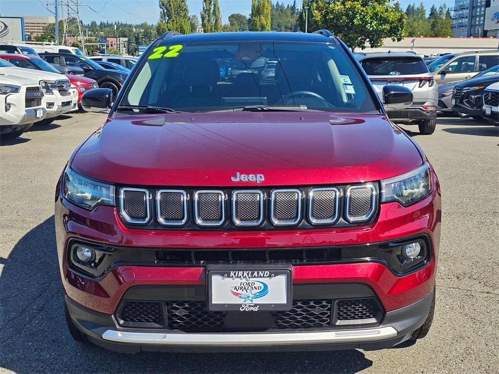Clean CARFAX. CARFAX One-Owner. Odometer is 9285 miles below market average! 4WD, 10.1" Touchscreen Display, 3.73 Axle Ratio, 4-Wheel Disc Brakes, 6 Speakers, ABS brakes, Air Conditioning, Alloy wheels, AM/FM radio: SiriusXM, Anti-whiplash front head restraints, Auto High-beam Headlights, Auto-dimming Rear-View mirror, Automatic temperature control, Brake assist, Bumpers: body-color, Compass, Delay-off headlights, Disassociated Touchscreen Display, Driver door bin, Driver vanity mirror, Dual front impact airbags, Dual front side impact airbags, Electronic Stability Control, Emergency communication system: SiriusXM Guardian, Four wheel independent suspension, Front anti-roll bar, Front Bucket Seats, Front Center Armrest w/Storage, Front dual zone A/C, Front fog lights, Front License Plate Bracket, Front reading lights, Fully automatic headlights, Global Telematics Box Module (TBM), Gloss Black Exterior Mirrors, Heated door mirrors, Heated front seats, Heated steering wheel, Illuminated entry, Knee airbag, Leather Shift Knob, Leather Trimmed Bucket Seats, Low tire pressure warning, Occupant sensing airbag, Outside temperature display, Overhead airbag, Overhead console, Panic alarm, ParkView Rear Back-Up Camera, Passenger door bin, Passenger vanity mirror, Power door mirrors, Power driver seat, Power steering, Power windows, Quick Order Package 2GG, Radio: Uconnect 5 w/10.1" Display, Rain sensing wipers, Rear anti-roll bar, Rear seat center armrest, Rear window defroster, Rear window wiper, Remote keyless entry, Roof rack: rails only, Security system, Speed control, Split folding rear seat, Spoiler, Steering wheel mounted audio controls, Tachometer, Telescoping steering wheel, Tilt steering wheel, Traction control, Trip computer, Turn signal indicator mirrors, Variably intermittent wipers, Wheels: 18" x 7" Painted Diamond Cut Aluminum, 4WD. 2022 Jeep Compass Limited 2.4L I4 9-Speed 948TE Automatic 4WD 4D Sport Utility Velvet Red Pearlcoat