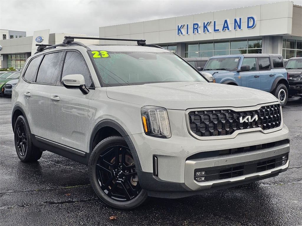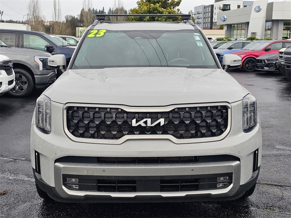 CARFAX One-Owner. 10 Speakers, 3.648 Axle Ratio, 3rd row seats: split-bench, 4-Wheel Disc Brakes, ABS brakes, Air Conditioning, Alloy wheels, AM/FM radio: SiriusXM, Apple CarPlay & Android Auto, Auto High-beam Headlights, Auto-dimming Rear-View mirror, Auto-leveling suspension, Automatic temperature control, Brake assist, Bumpers: body-color, Cargo Cover, Carpet Floor Mats, Compass, Cross Bars X-Line, Delay-off headlights, Driver door bin, Driver vanity mirror, Dual front impact airbags, Dual front side impact airbags, Electronic Stability Control, Emergency communication system: 911 Connect, Exterior Parking Camera Rear, Folding Cargo Tray, Four wheel independent suspension, Front anti-roll bar, Front Bucket Seats, Front Center Armrest, Front dual zone A/C, Front fog lights, Front reading lights, Fully automatic headlights, Garage door transmitter: HomeLink, harman/kardon® Speakers, Heads-Up Display, Heated & Ventilated Front Bucket Seats, Heated door mirrors, Heated front seats, Heated rear seats, Heated steering wheel, Hybrid Cargo Net, Illuminated entry, Knee airbag, Leather Shift Knob, Leather steering wheel, Low tire pressure warning, Memory seat, Navigation System, Occupant sensing airbag, Outside temperature display, Overhead airbag, Overhead console, Panic alarm, Passenger door bin, Passenger vanity mirror, Power door mirrors, Power driver seat, Power Liftgate, Power moonroof, Power passenger seat, Power steering, Power windows, Premium Nappa Leather Seat Trim, Radio data system, Radio: AM/FM harman/kardon Audio System, Rain sensing wipers, Rear air conditioning, Rear anti-roll bar, Rear audio controls, Rear reading lights, Rear side impact airbag, Rear window defroster, Rear window wiper, Reclining 3rd row seat, Remote keyless entry, Roof rack: rails only, Security system, Smart Key w/ Push Button and Remote Start, Speed control, Speed-sensing steering, Split folding rear seat, Spoiler, Steering wheel mounted audio controls, Tachometer, Telescoping steering wheel, Tilt steering wheel, Traction control, Trip computer, Turn signal indicator mirrors, Variably intermittent wipers, Ventilated front seats, Ventilated rear seats, Wheels: 20" x 7.5" Black Finish X-LINE Exclusive. 2023 Kia Telluride SX-Prestige X-Line 3.8L V6 DGI DOHC Dual CVVT 8-Speed Automatic AWD 4D Sport Utility Wolf Gray