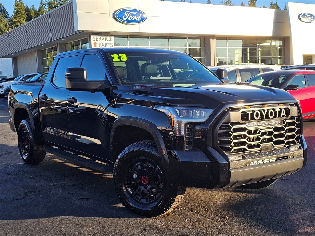 BACK UP CAMERA, LEATHER, PANORAMIC SUNROOF, 3.4L V6, Towing Technology Package, 12 Speakers, 3.31 Axle Ratio, 4-Wheel Disc Brakes, 400W/120V AC Rear Seat & Bed Power Supply, ABS brakes, Air Conditioning, Alloy wheels, AM/FM radio: SiriusXM, Apple CarPlay/Android Auto, Auto High-beam Headlights, Auto-dimming door mirrors, Auto-dimming Rear-View mirror, Automatic temperature control, Black Dual Exhaust Tips w/Debossed TRD Pro Logo, Brake assist, Bumpers: body-color, Delay-off headlights, Driver door bin, Driver vanity mirror, Dual front impact airbags, Dual front side impact airbags, Electronic Stability Control, Emergency communication system: Safety Connect (10-year trial), Front & Rear Mud Guards, Front anti-roll bar, Front Bucket Seats, Front Center Armrest, Front dual zone A/C, Front fog lights, Front reading lights, Front wheel independent suspension, Fully automatic headlights, Garage door transmitter: HomeLink, Heated & Ventilated Front Bucket Seats, Heated Color-Keyed Outside Mirrors, Heated door mirrors, Heated front seats, Heated steering wheel, Illuminated entry, Knee airbag, Leather Shift Knob, LED Lightbar w/Fog & Marker Lights, Low tire pressure warning, Memory seat, Multi-Terrain Back Monitor, Navigation System, Occupant sensing airbag, Outside temperature display, Overhead airbag, Overhead console, Panic alarm, Passenger door bin, Passenger vanity mirror, Power door mirrors, Power driver seat, Power moonroof, Power Panoramic Roof, Power passenger seat, Power steering, Power windows, Qi-Compatible Wireless Smartphone Charger, Radio data system, Radio: Premium Audio w/JBL, Rear reading lights, Rear seat center armrest, Rear step bumper, Rear window defroster, Remote keyless entry, Security system, Smoked-Finish Premium LED Headlights & DRL, SofTex Seat Trim, Speed control, Speed-sensing steering, Split folding rear seat, Sport steering wheel, Steering wheel mounted audio controls, Tachometer, Telescoping steering wheel, Tilt steering wheel, Traction control, TRD Pro Heated Leather-Trimmed Steering Wheel, Trip computer, Turn signal indicator mirrors, Variably intermittent wipers, Ventilated front seats, Voltmeter, Wheels: 18" x 8" Black BBS Forged Aluminum, CONSOLE SAFE, 3.4L V6, Towing Technology Package. 2023 Toyota Tundra Hybrid TRD Pro 3.4L V6 10-Speed Automatic 4WD 4D Crew Cab Midnight Black Metallic