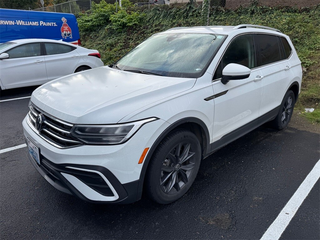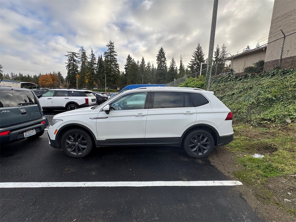 Recent Arrival! CARFAX One-Owner. Odometer is 13379 miles below market average! AWD, 3.33 Axle Ratio, 4-Wheel Disc Brakes, 4-Wheel Independent Suspension, 6 Speakers, ABS brakes, Air Conditioning, Alloy wheels, AM/FM radio: SiriusXM with 360L, Auto-dimming Rear-View mirror, Automatic temperature control, Brake assist, Bumpers: body-color, Compass, Delay-off headlights, Driver door bin, Driver vanity mirror, Dual front impact airbags, Dual front side impact airbags, Electronic Stability Control, Emergency communication system: Car-Net, Exterior Parking Camera Rear, Four wheel independent suspension, Front anti-roll bar, Front Bucket Seats, Front Center Armrest, Front dual zone A/C, Front reading lights, Fully automatic headlights, Heated door mirrors, Heated Front Comfort Seats, Heated front seats, Illuminated entry, Leather Shift Knob, Low tire pressure warning, Occupant sensing airbag, Outside temperature display, Overhead airbag, Overhead console, Panic alarm, Passenger door bin, Passenger vanity mirror, Perforated V-Tex Leatherette Seating Surfaces, Power door mirrors, Power driver seat, Power Liftgate, Power steering, Power windows, Radio data system, Radio: MIB3 Composition Media AM/FM/HD, Rain sensing wipers, Rear anti-roll bar, Rear reading lights, Rear seat center armrest, Rear window defroster, Rear window wiper, Remote keyless entry, Roof rack: rails only, Security system, Speed control, Speed-sensing steering, Split folding rear seat, Spoiler, Steering wheel mounted audio controls, Tachometer, Telescoping steering wheel, Tilt steering wheel, Traction control, Trip computer, Turn signal indicator mirrors, Variably intermittent wipers, Wheels: 18" Dark Graphite 10-Spoke Alloy, AWD. 2022 Volkswagen Tiguan 2.0T SE 2.0L TSI DOHC 8-Speed Automatic with Tiptronic AWD 4D Sport Utility Pure White